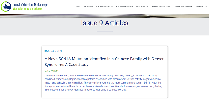 2020年6月26日,我院詹伟华院长为第一作者,李江波主任为第二作者的有关癫痫基因精准医疗的学术论文《A Novo SCN1A Mutation Identified in a Chinese Family with Dravet Syndrome: A Case Study》(《一个中国Dravet综合征家系中新发SCN1A基因突变的病例研究 》),荣登美国医学SCI《Journal of Clinical and Medical Images》(《临床与医学影像杂志》)核心期刊第九期。论文首次报道了SCN1A基因(c.2856G>A, p.Trp952X) 在儿童Dravet综合征的诊断意义,此论点基因通过查询ACMG被确定为在中国人群的首创报道,引起医疗学术界热议。这标志我院在癫痫病精准医疗方面与国际接轨,在癫痫医学研究领域迈上崭新台阶。